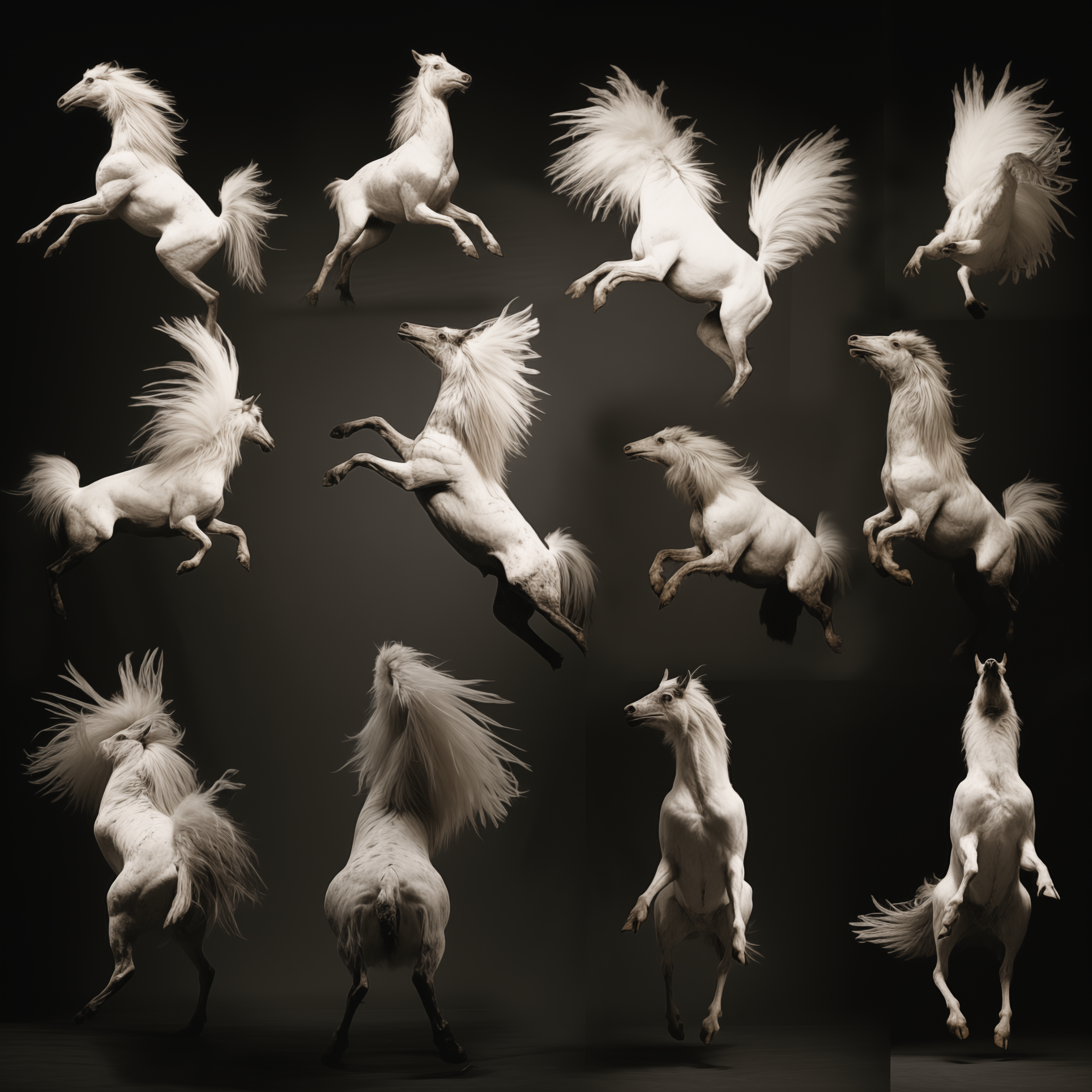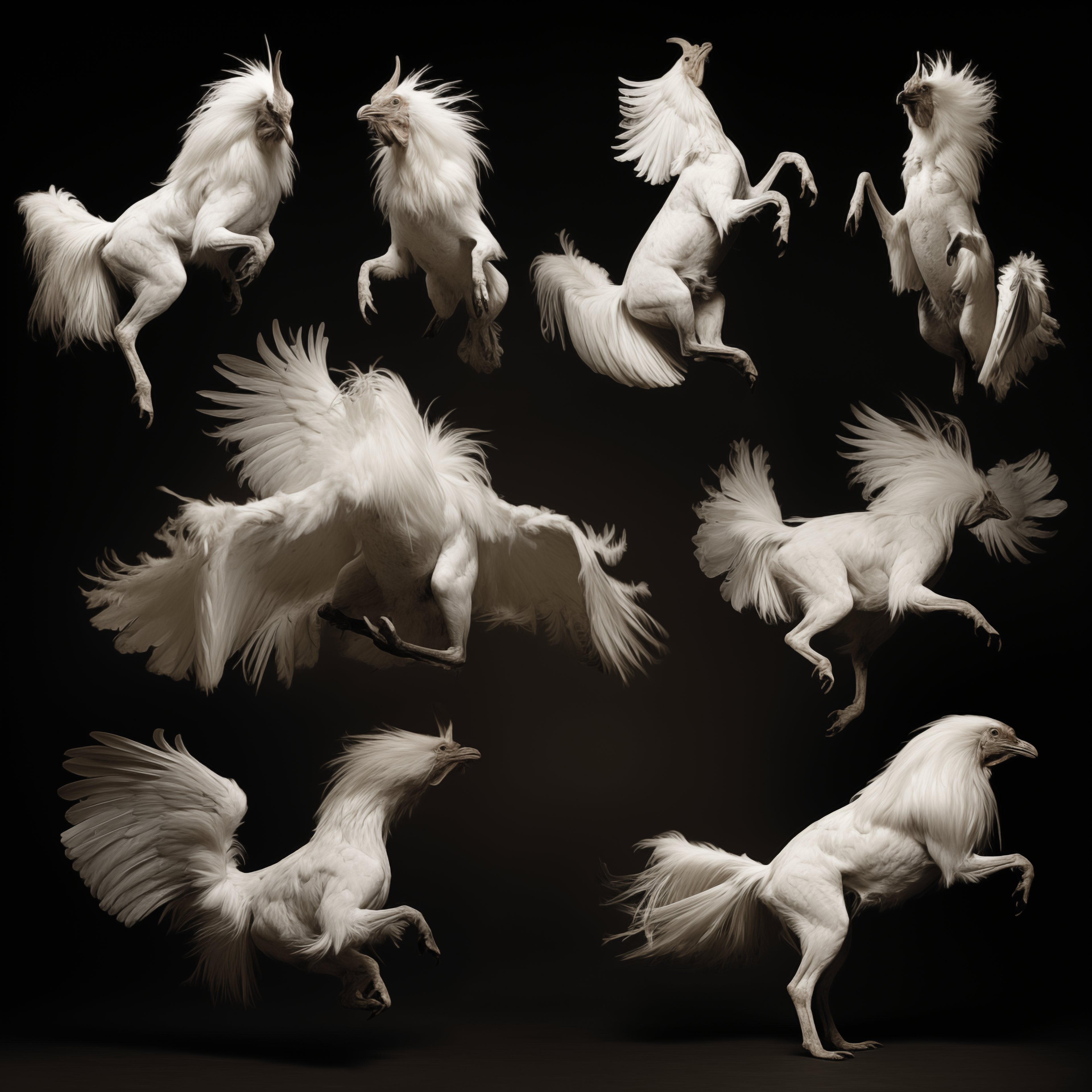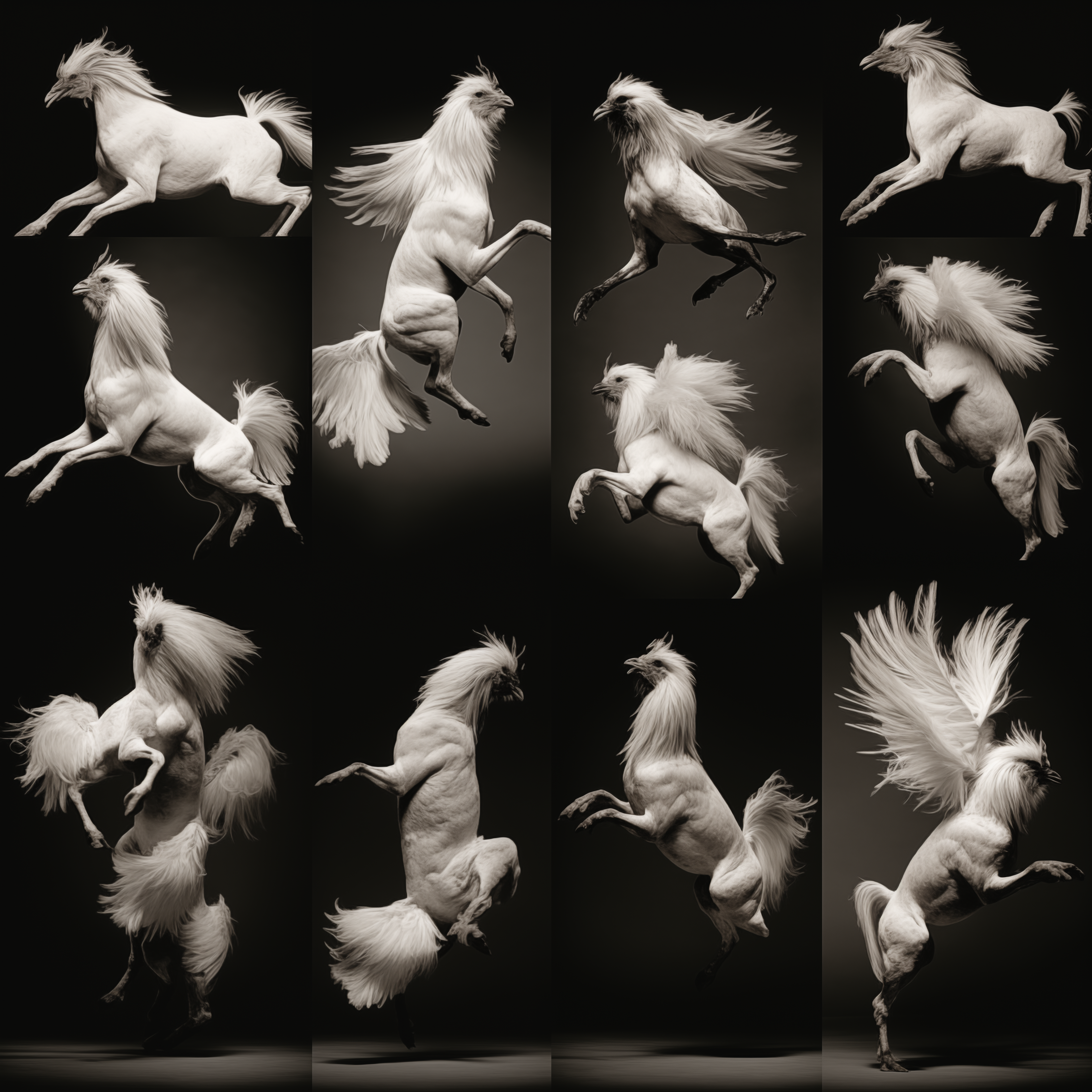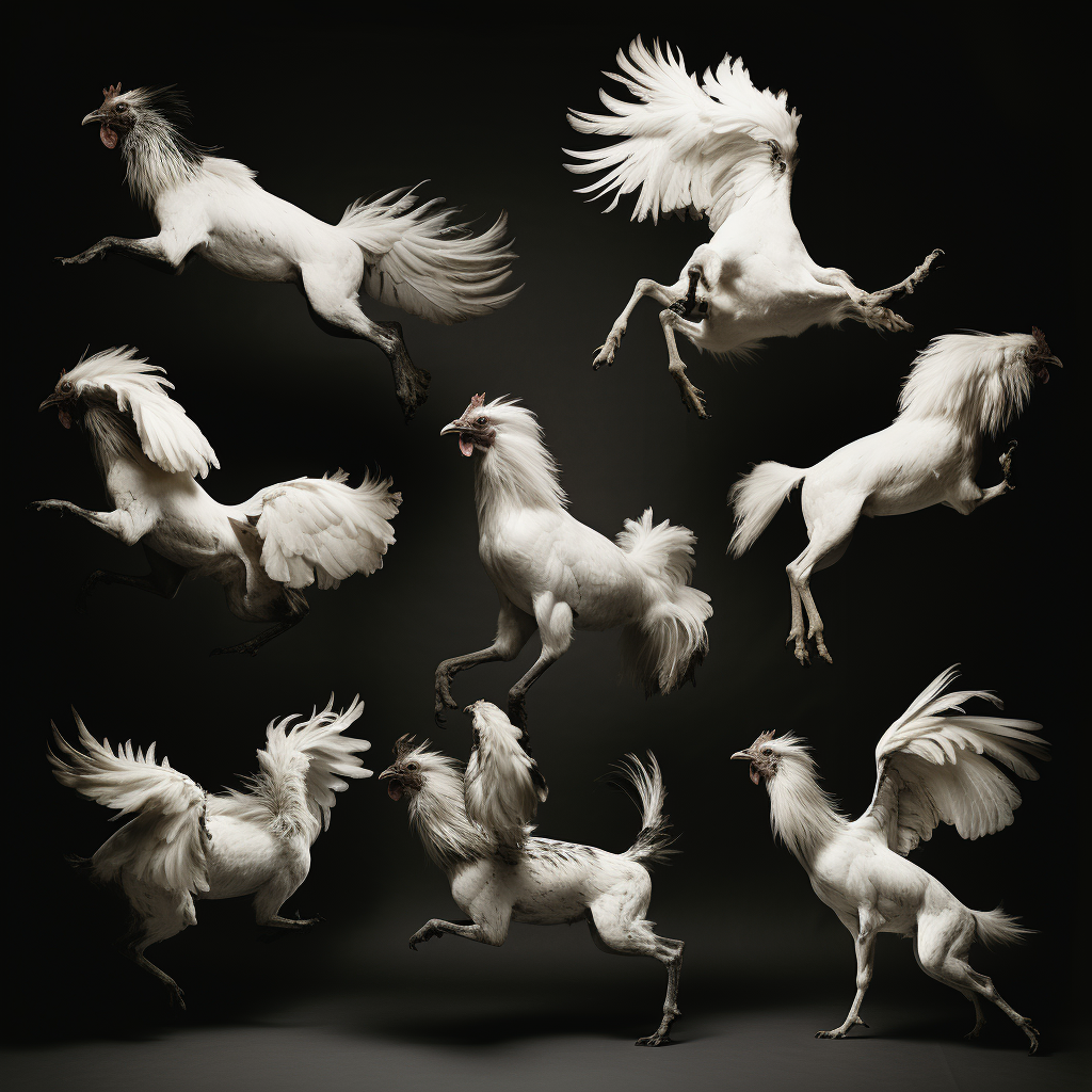 Considering the origins and construction of moving images, Hebron prompted Midjourney to return to Muybridge's canonical grids of animals in motion. She was interested to see if the AI model could discern - and predict - novel movement sequences and present them in a grid in return. Taking just one of the resulting images from the prompt 'Study of animals in motion int he style of Eadweard Muybridge', Hebron then asked midjourney to repeatedly generate nearly 1000 variations of that same image, without any changes to the original prompt. The result was a devolution of forms from a grid to a single animal, and from a horse, to a chimerical rooster. The images here are just a few key examples from the beginning, middle, and end of the numerous iterations.