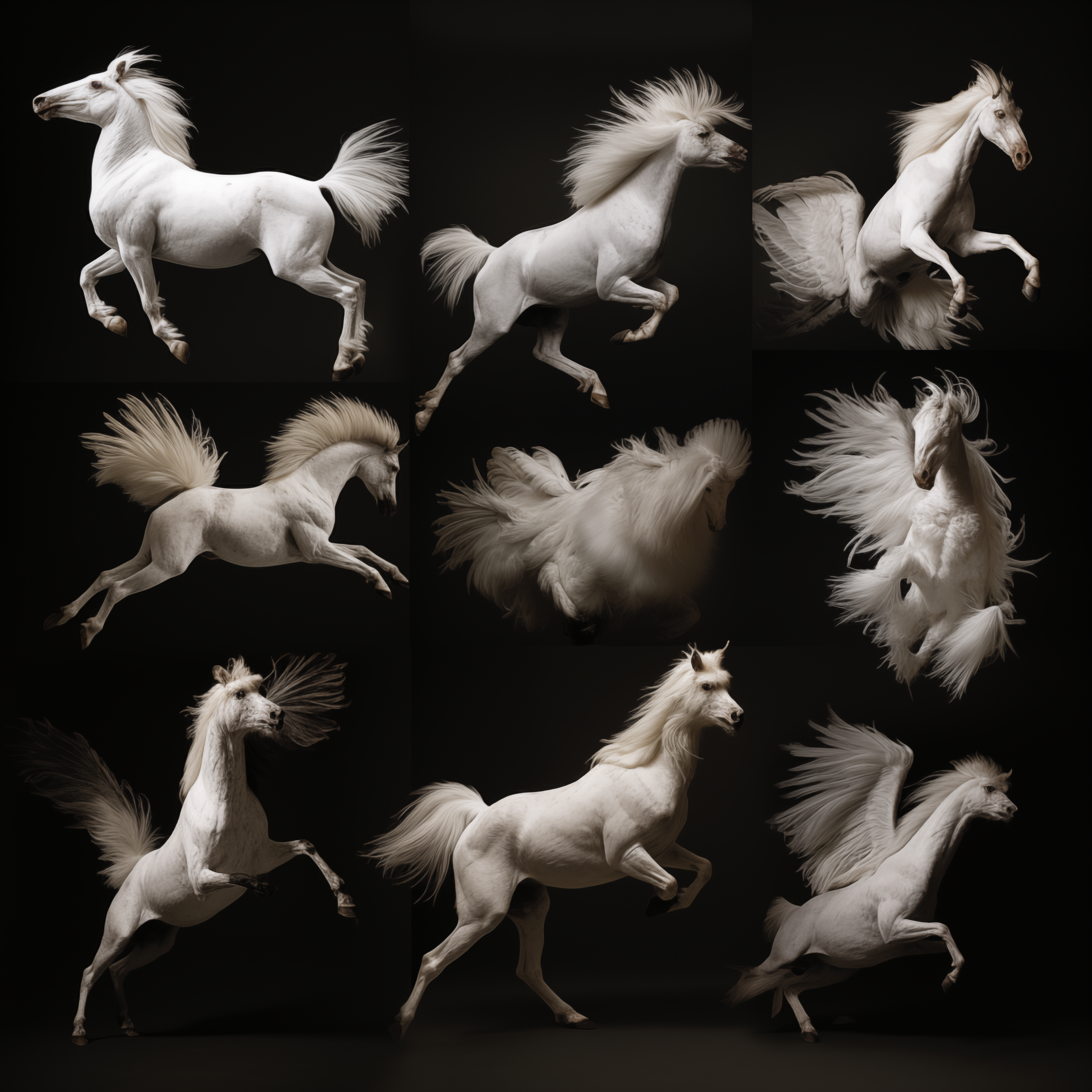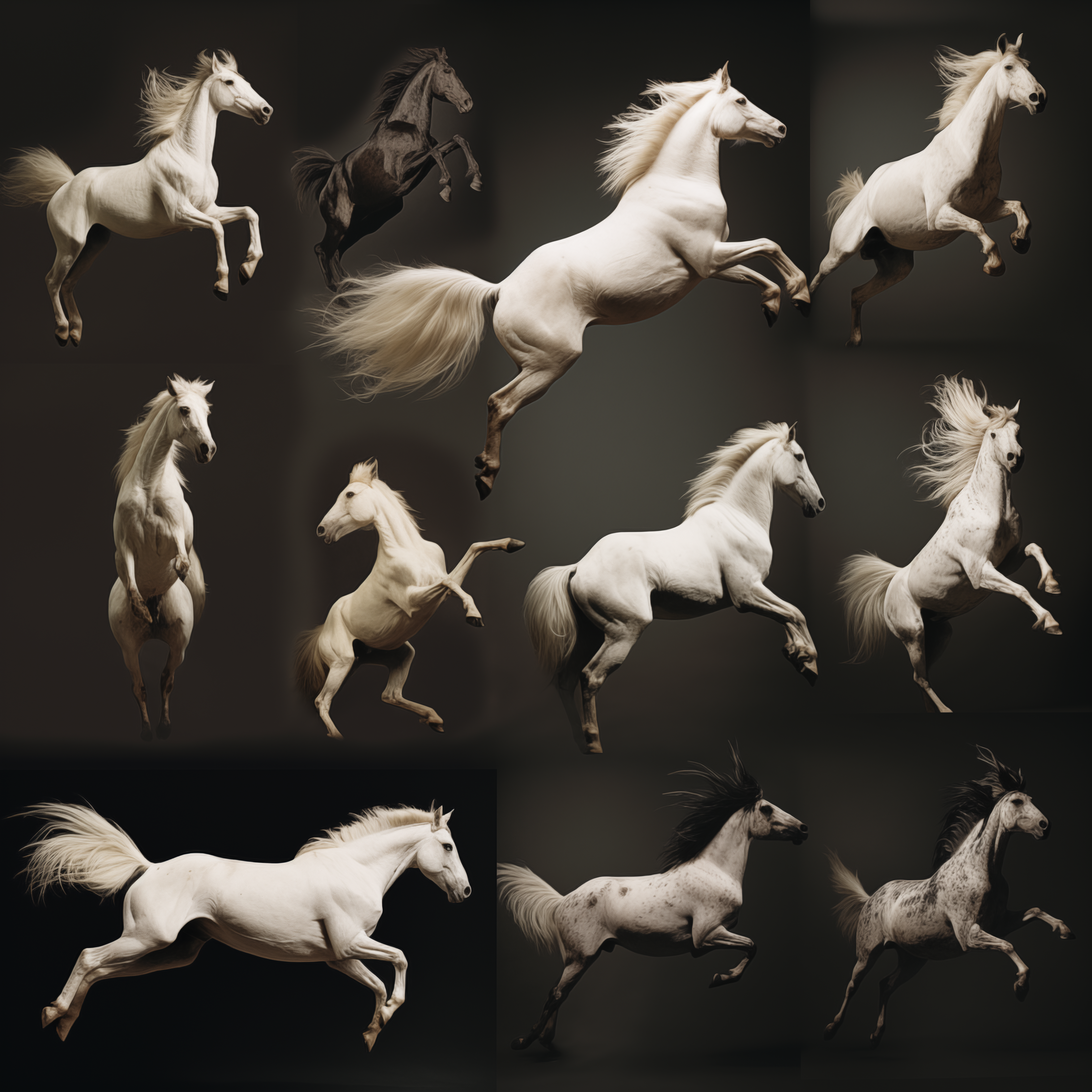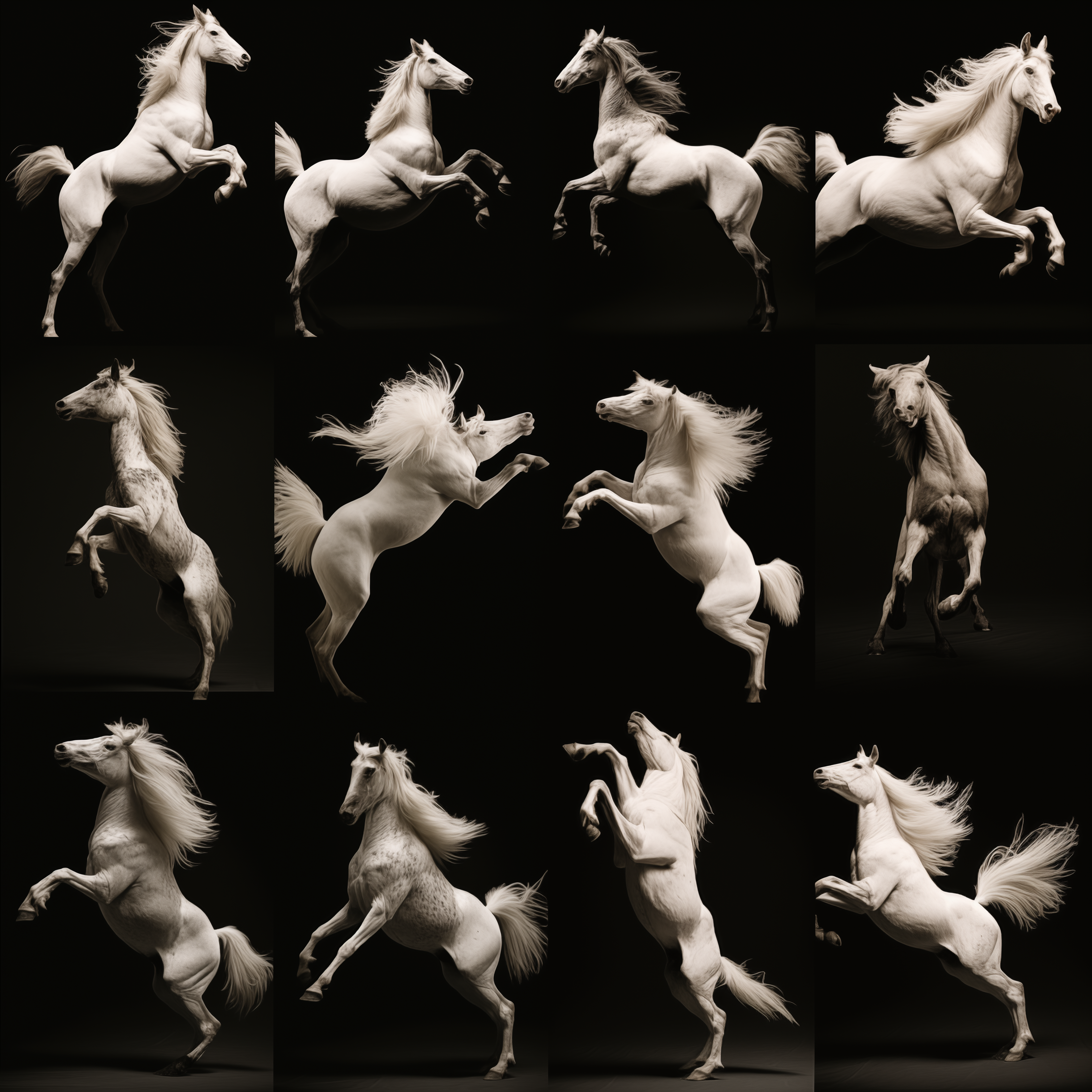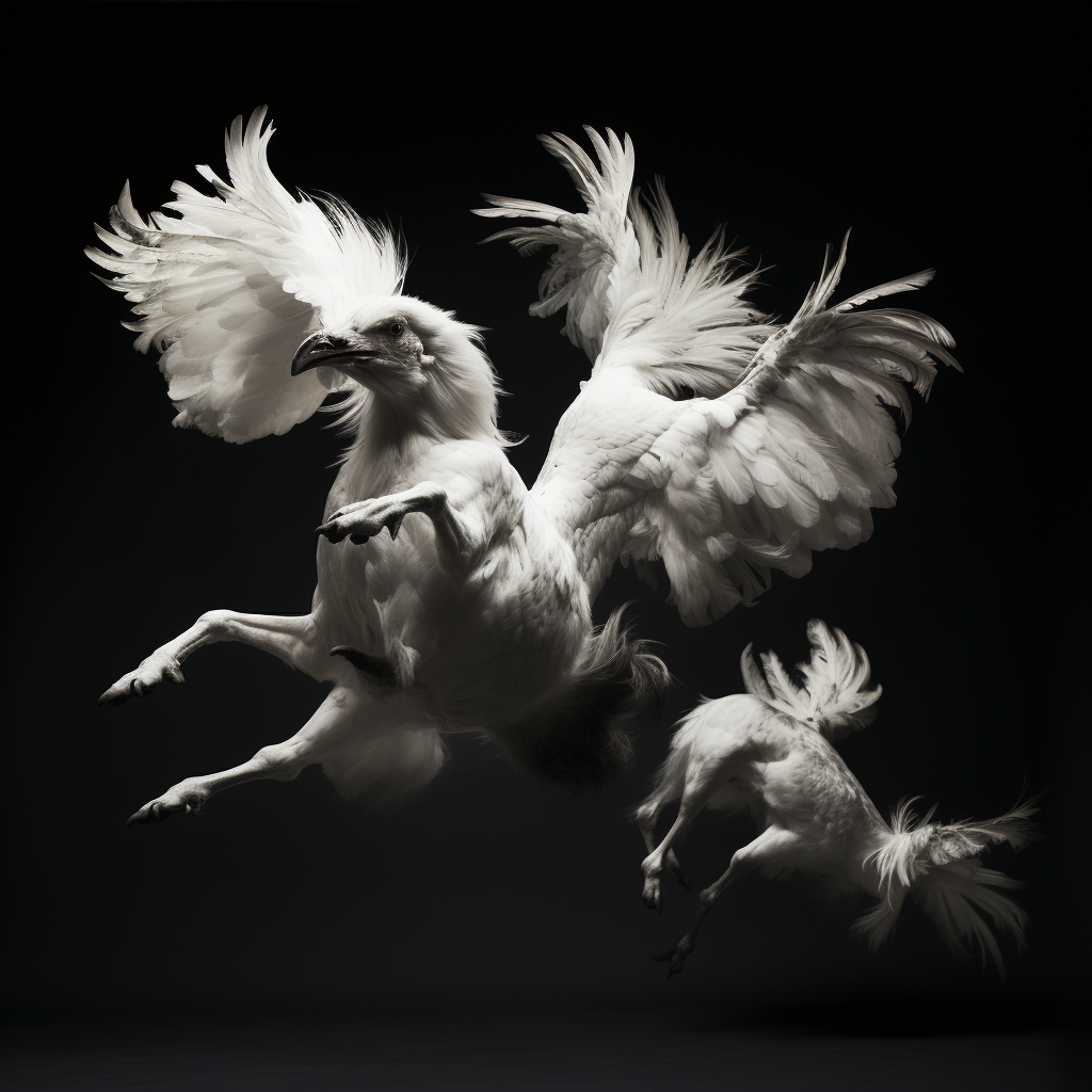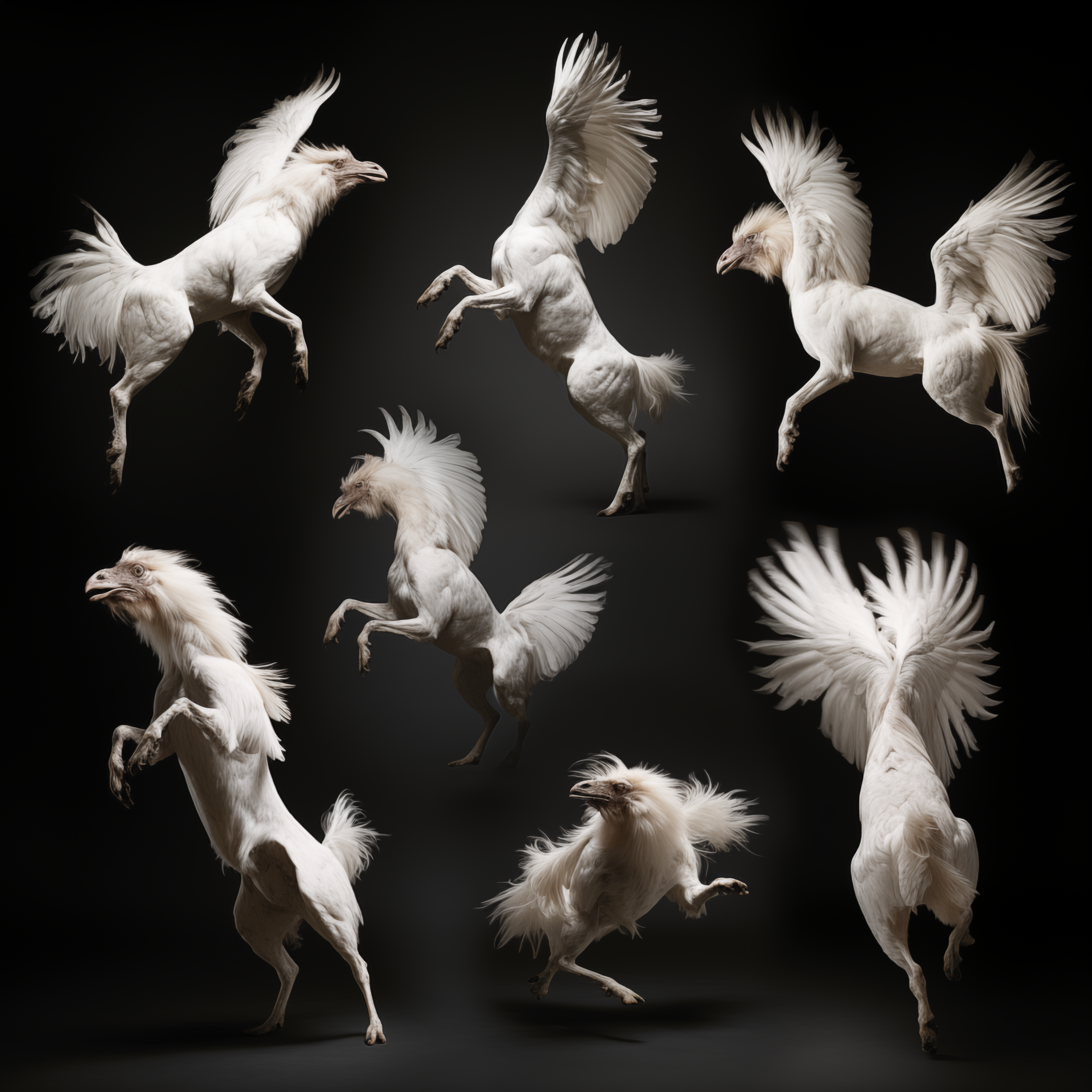 Considering the origins and construction of moving images, Hebron prompted Midjourney to return to Muybridge's canonical grids of animals in motion. She was interested to see if the AI model could discern - and predict - novel movement sequences and present them in a grid in return. Taking just one of the resulting images from the prompt 'Study of animals in motion int he style of Eadweard Muybridge', Hebron then asked midjourney to repeatedly generate nearly 1000 variations of that same image, without any changes to the original prompt. The result was a devolution of forms from a grid to a single animal, and from a horse, to a chimerical rooster. The images here are just a few key examples from the beginning, middle, and end of the numerous iterations.