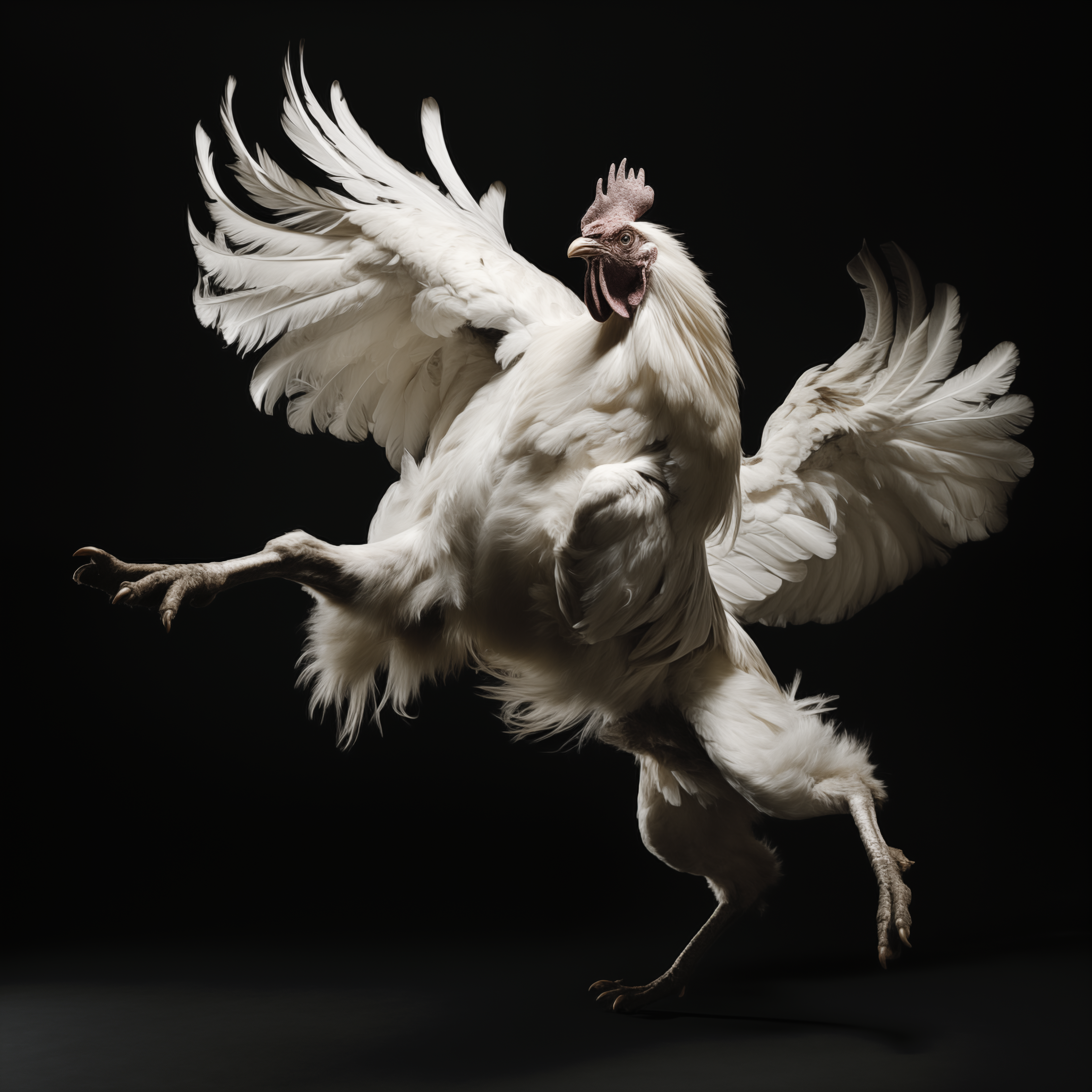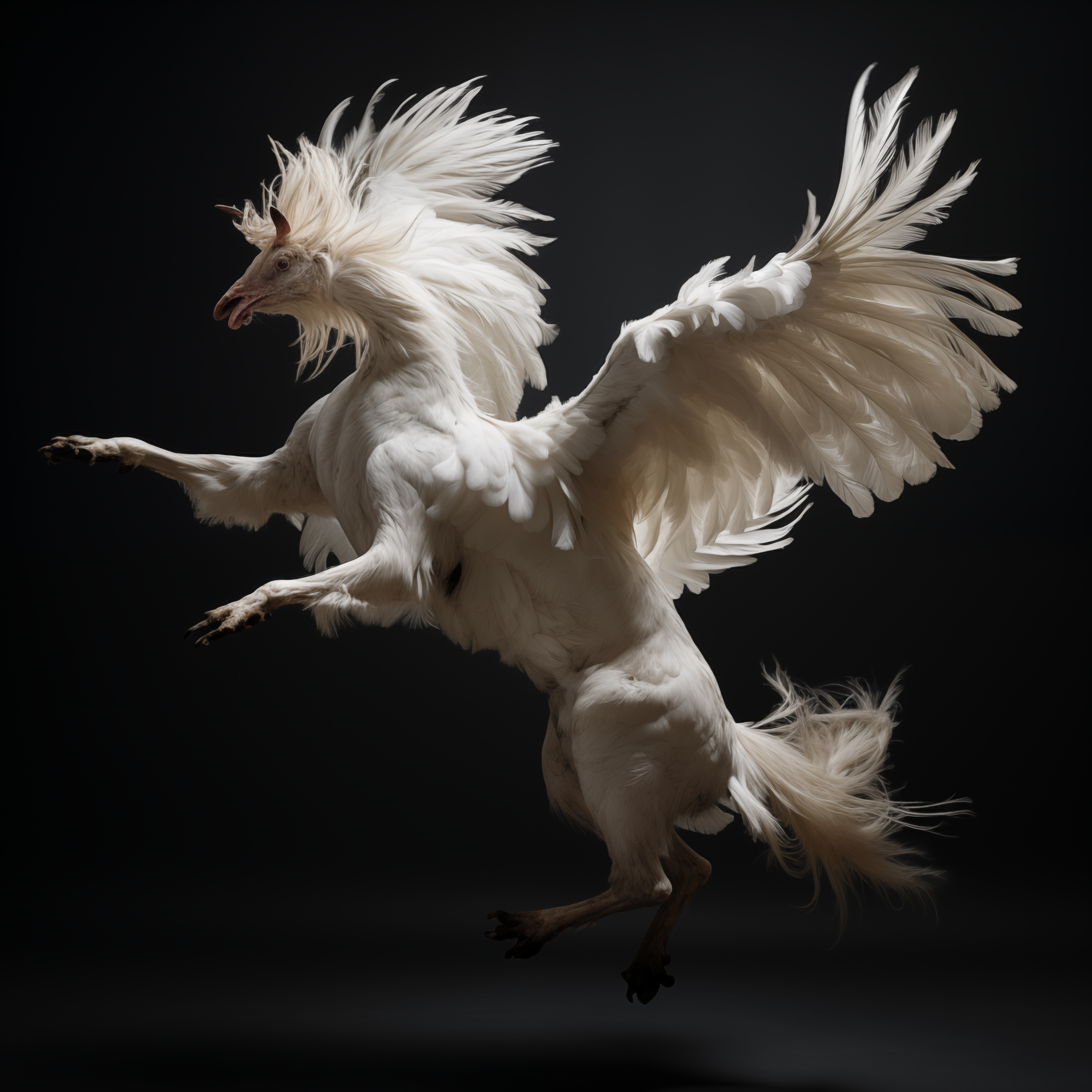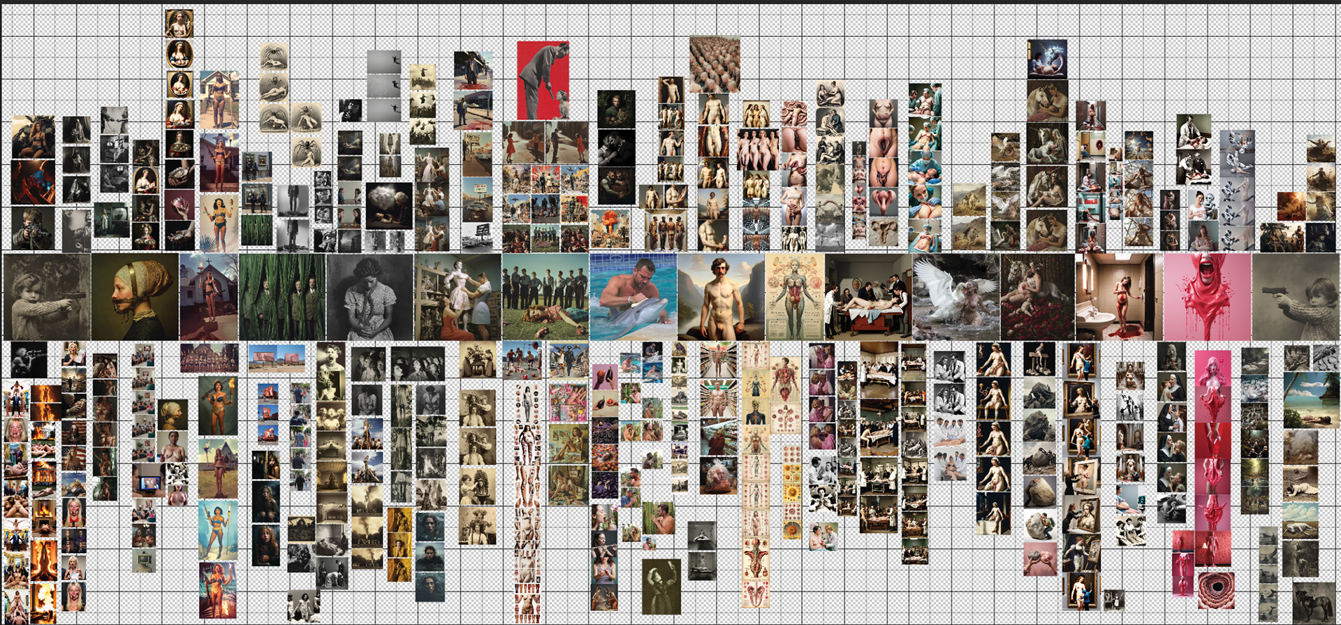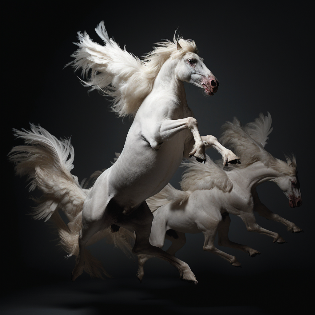 Considering the origins and construction of moving images, Hebron prompted Midjourney to return to Muybridge's canonical grids of animals in motion. She was interested to see if the AI model could discern - and predict - novel movement sequences and present them in a grid in return. Taking just one of the resulting images from the prompt 'Study of animals in motion int he style of Eadweard Muybridge', Hebron then asked midjourney to repeatedly generate nearly 1000 variations of that same image, without any changes to the original prompt. The result was a devolution of forms from a grid to a single animal, and from a horse, to a chimerical rooster. The images here are just a few key examples from the beginning, middle, and end of the numerous iterations.