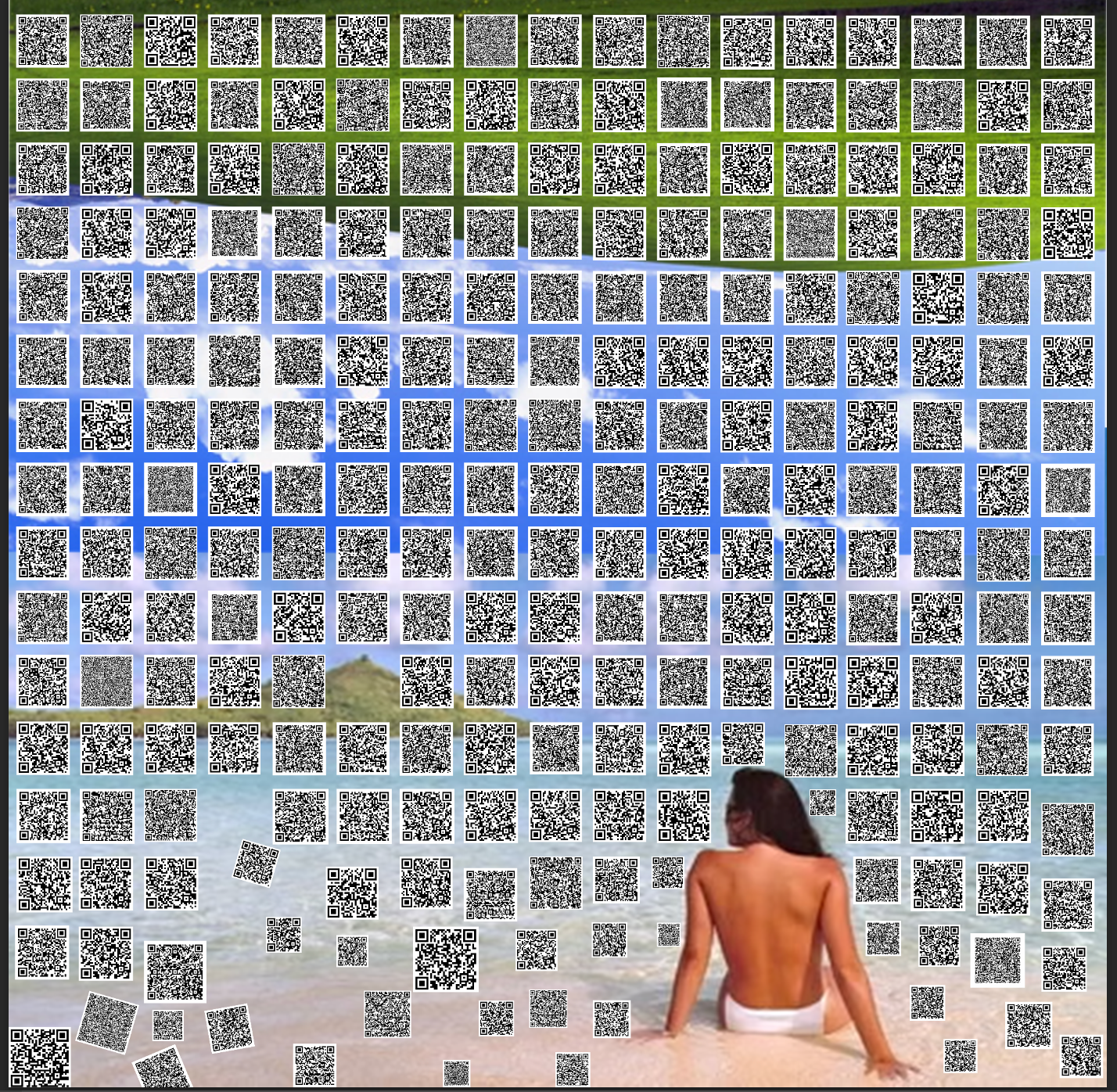 Curriculum is a large wall piece that features a grid of QR codes overlaid atop 2 images (“Jennifer in Paradise”, the first image ever photoshopped; and “Bliss”, the Microsoft background, and the most viewed image in the world). Each QR code takes the viewer to a different link – a video, article, image, news story, Wikipedia page- which offers information about the images and themes in the other two pieces in the show. The series of links can also be thought of as a curriculum that reveals the artist’s own algorithm.