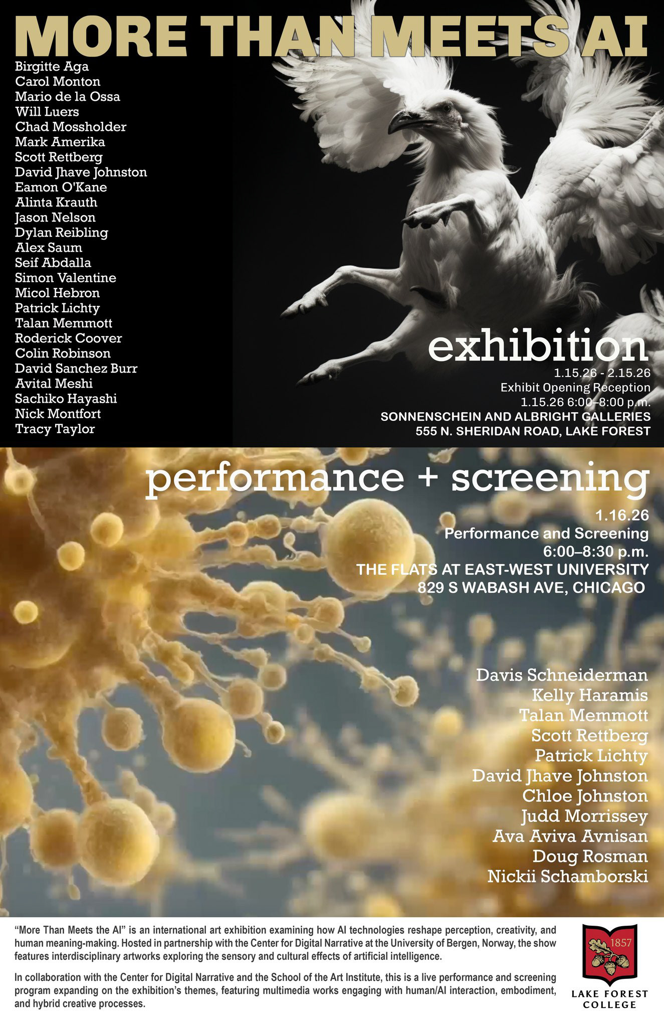 January, 2026, Two bodies of Micol's AI work are on view in the "More Than Meets AI" exhibition at the Sonnenschein and Albright Galleries, Lakeforest College, Lake Forest, IL